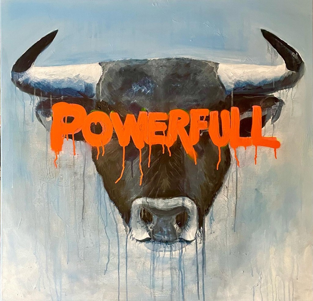«Shit happens» 80 cm x 80 cm, Acrylic, mixed media on canvas, with yellow hover frame. SOLGT!